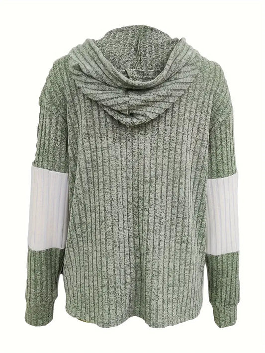 Color Block Zip Up Drawstring Hoodie Rib Knit Sweatshirt